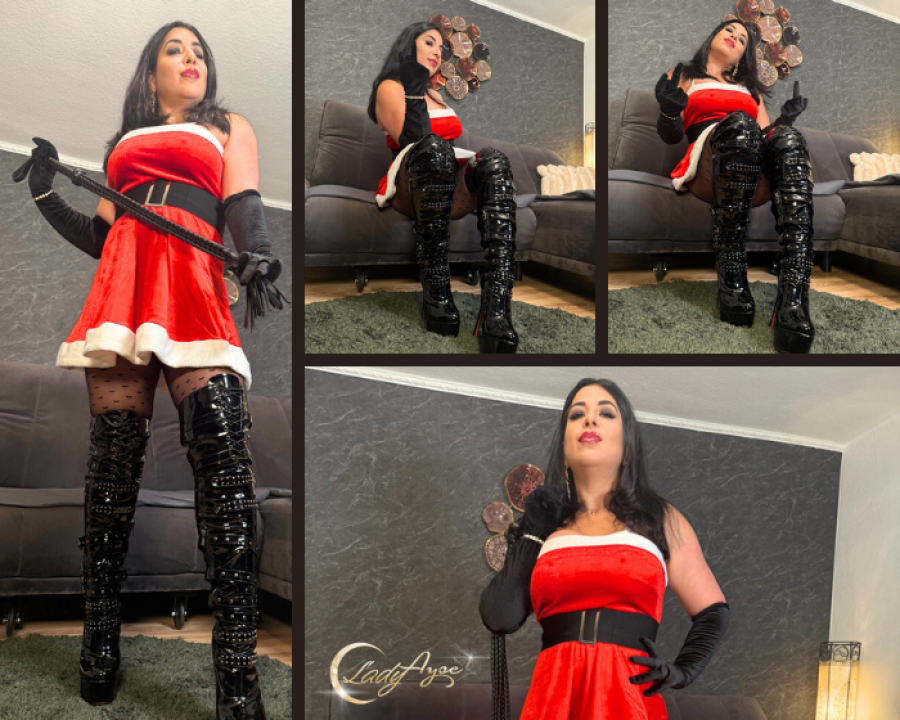 Weihnachten wird nicht süß, sondern kalt und gnadenlos. In diesem Clip siehst du mich in einem sündigen roten Weihnachtskleid, das gerade genug verbirgt. Mein Mini Kleid schmiegt sich an meinen Körper, darunter glänzen verführerisch meine schwarzen Nylons. Die Lack Stiefel knallen mit jedem Schritt auf den Boden. Und in meiner Hand halte ich eine Peitsche, bereit für dein stilles Flehen.